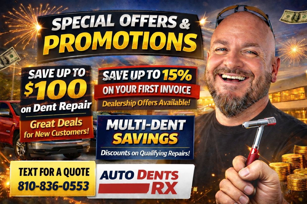 Save on qualifying dent repair services with limited-time offers from Auto Dents RX. Fast quotes, mobile service, and real savings.
